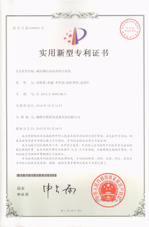 • 減壓閥自動(dòng)反沖排污系統(tǒng)專利證書
