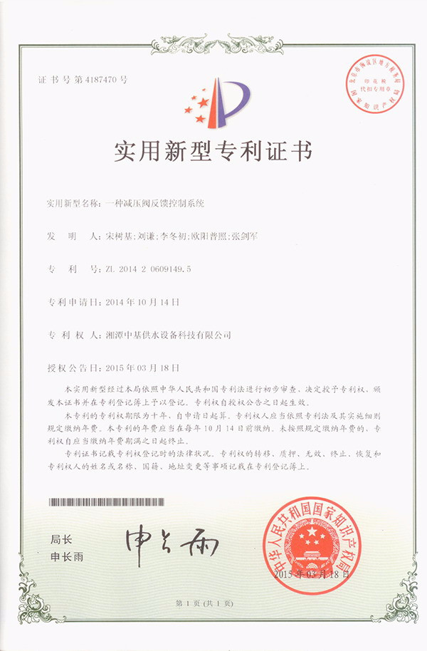 • 一種減壓閥反饋控制系統(tǒng)專利證書
